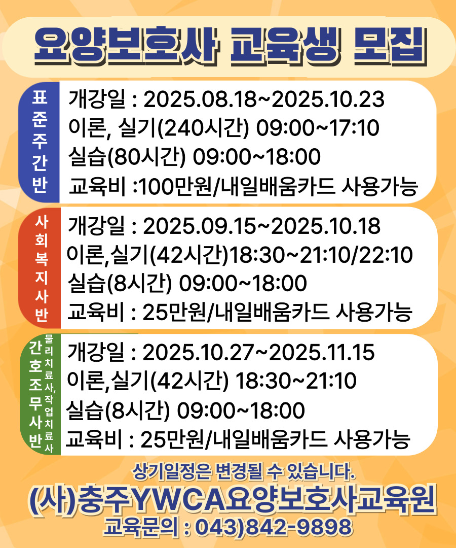 요양보호사 교육생 모집을 진행하고 있사오니 일정 확인하시어 신청 부탁 드립니다.